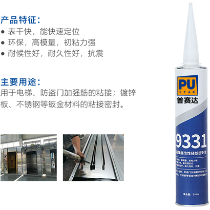 用于電梯、防盜門加強筋的粘接;鍍鋅板、不銹鋼等鈑金材料的粘接密封。